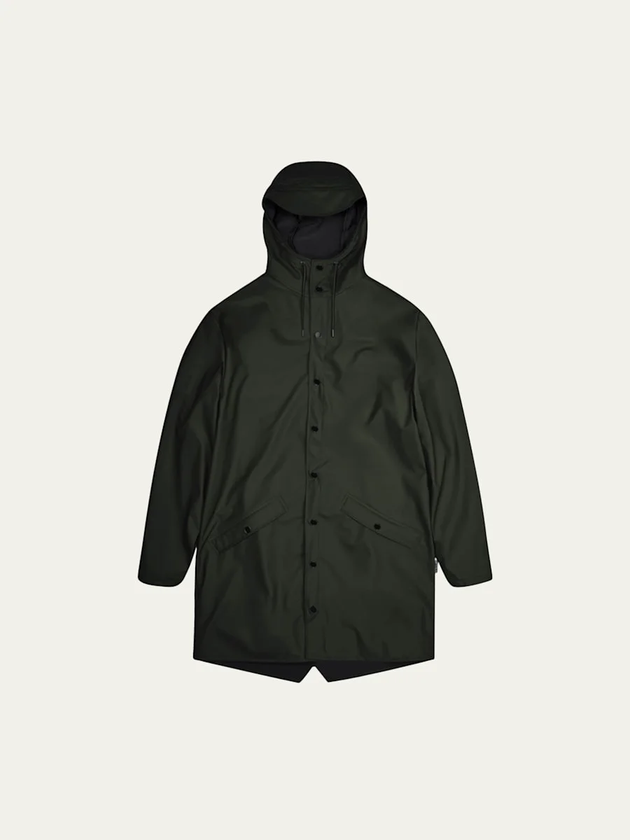 Rains long raincoat Drawstring hood; rain shield back Long sleeves; adjustable cuffs Under-arm eyelets Snap placket front Double welded slanting flap pockets Hem falls to the knee Fishtail hem Polyester/polyurethane Hand wash, wipe clean Imported Model is 5'10"/177cm. Online Inquiries: BGS21_T3N45| Store Inquiries: #4343866