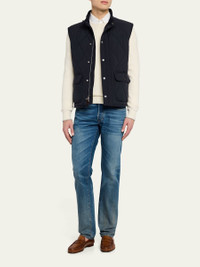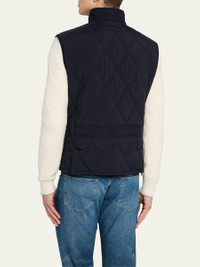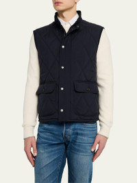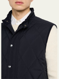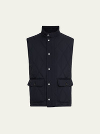 Ralph Lauren Purple Label "Carleton" diamond-quilted vest Mock neck with corduroy facing Throat latch with a snapped closure Full-zip front Snapped storm placket Suede zipper pull Two front waist flap pockets Interior left chest pocket Interior right waist pocket Corduroy binding at the armholes Double vent with snapped closures Fully lined and filled Genuine horn buttons Goose down/feather fill Polyester/cotton/cashmere Lining: Cashmere/cotton/mulberry silk/nylon Made in Italy Online Inquiries: BGS21_NCUDK| Store Inquiries: #4953196
