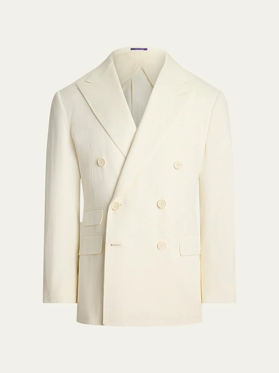 Ralph Lauren Purple Label "Kent" solid suit jacket Approx. 30"L from shoulder to hem Peak lapels; buttonhole at left lapel Doublebreasted silhouette Unfinished cuffs ready for customtailoring Left chest welt pocket Ticket pocket Two front waist flapped pockets Two interior chest pockets Halflined Cotton/linen Lining: Cupro/viscose/wool Dry clean Made in Italy
