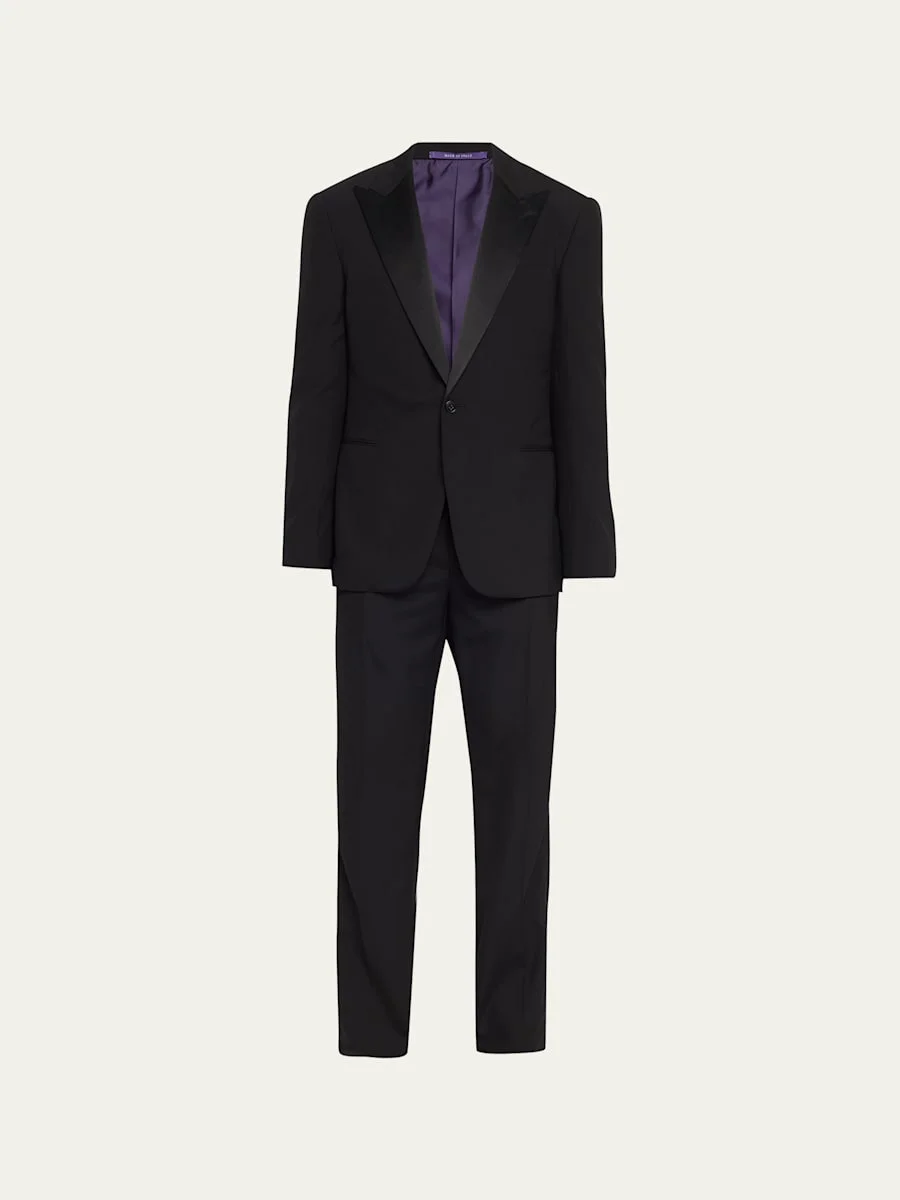 Ralph Lauren Purple Label polo tuxedo crafted of luxurious wool barathea Slim fit Lining: Cupro/viscose Dry clean Made in Italy Jacket: Rolled lapels and hand-sewn natural shoulders distinguish the half-canvassed jacket More structure in the chest and shoulders Satin peak lapels; buttonhole at the left lapel One-button silhouette Left chest welt pocket Two front waist flapped pockets Two interior pockets Fully lined body and sleeves Cuffs with four decorative buttons Trousers: Side adjusters Curtain waistband Flat front Zip fly with extended hook-and-bar closure Side on-seam pockets Two back buttoned pockets Satin stripe down each leg Unfinished hem to be tailored to desired length Model is 6'1"/185cm. Online Inquiries: BGS21_NB78C| Store Inquiries: #4597417