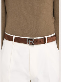 Crafted of luxuriously soft suede, this belt by Ralph Lauren Purple Label is finished with the signature stacked "RL" monogram plaque buckle in a slightly distressed finish. Approx. 1.25"W Silvertone metal pin buckle Single suede keeper loop Subtly pointed tip Adjustable fit Leather lining Made in Italy Online Inquiries: BGS21_NENRJ| Store Inquiries: #5428155
