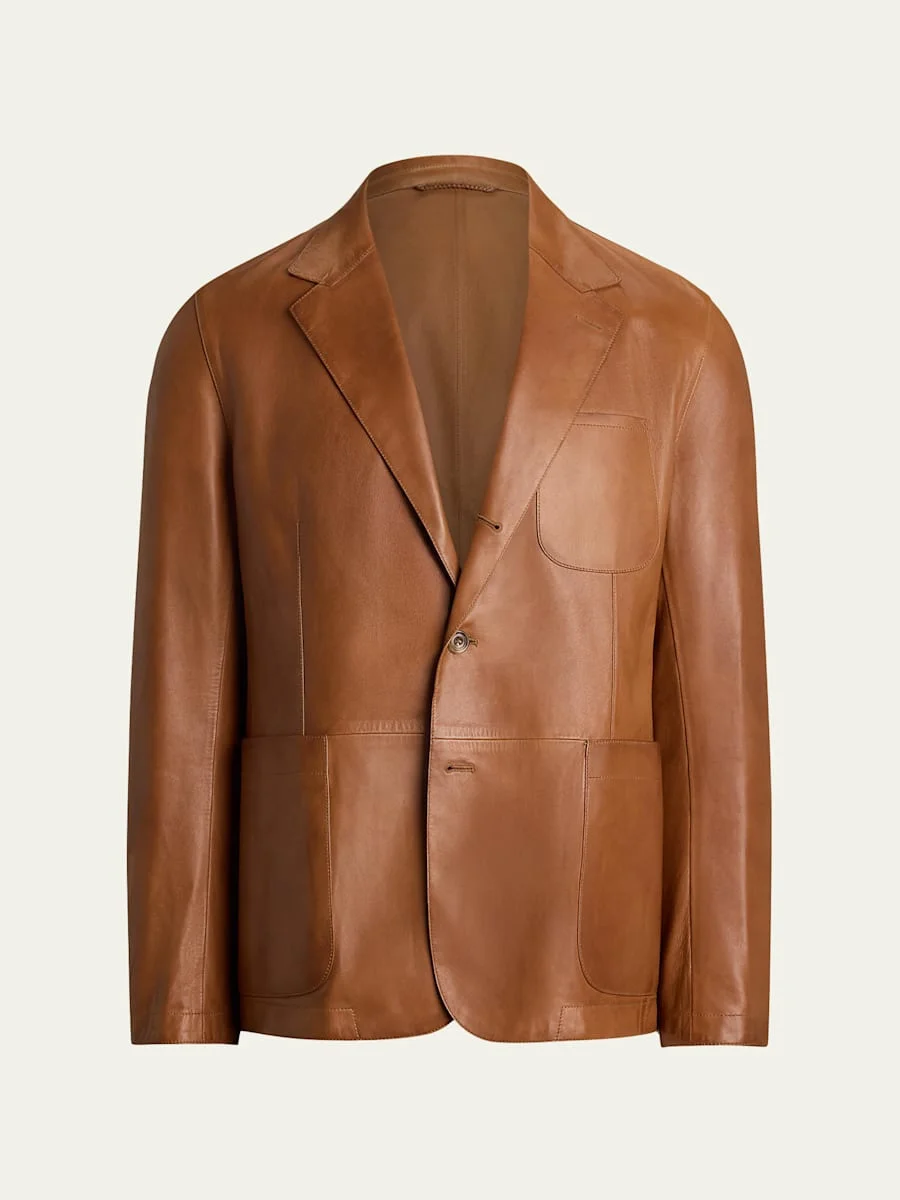 Ralph Lauren Purple Label sport coat stylized in premium leather for unique character Notched lapels Singlebreasted front Three front patch pockets Long sleeves Doublebutton cuffs Singlevented back Leather Made in Italy