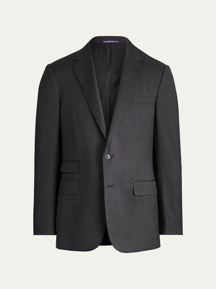 Ralph Lauren two-piece suit in solid weave. Notch lapel; two button front. Basted sleeves. Chest welt pocket. Front flap pockets. Modern fit. Double-vented back. Includes matching flat-front trousers with straight leg. Unfinished hem to be tailored to desired length. Super 130s worsted wool. Made in Italy. Model is 6'1"/185cm. Online Inquiries: BGS21_N5TJ1| Store Inquiries: #2828937