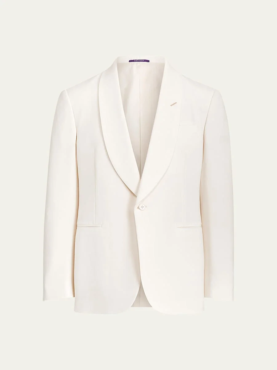 Ralph Lauren Purple Label solid dinner jacket Shawl lapels; singlebutton front Chest and side welt pockets Fourbutton sleeve finish Doublevented back Wool/silk Made in Italy
