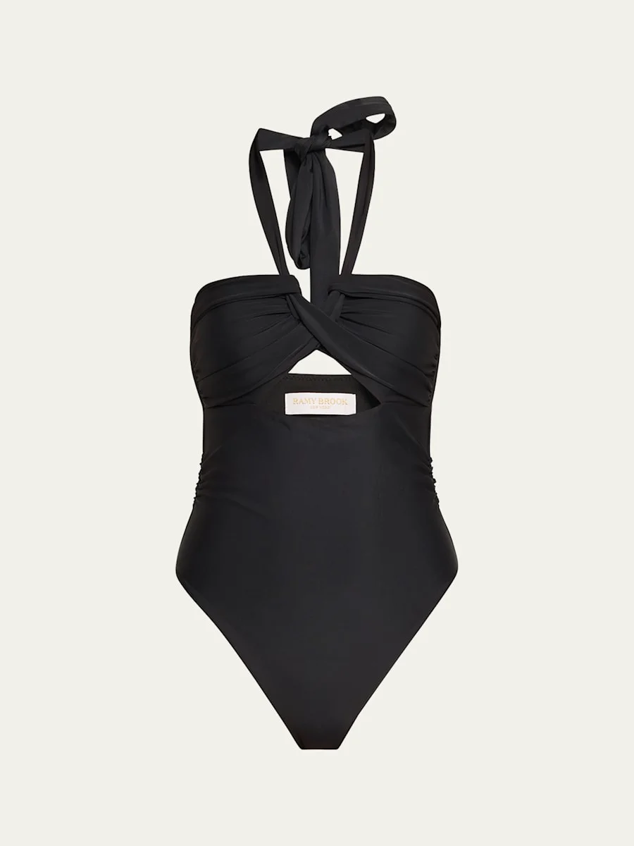 Ramy Brook "Arielle" solid onepiece swimsuit finished with an underbust keyhole cutout Halter neckline; selfties behind the neck Moderate seat coverage Nylon/polyamide/spandex Lining: Polyester/spandex Hand wash, wash separately Imported