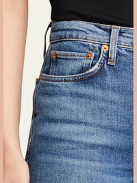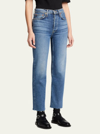 RE/DONE stovepipe jeans in stretch-denim. Approx. measurements: 11.25" rise; 27" inseam; 14.25" leg opening. Five-pocket style. Fitted through straight legs. Cropped at ankles. Frayed raw-edge hem. Button/zip fly; belt loops. Cotton/polyester/spandex. Machine wash. Imported. Online Inquiries: BGS21_TZZS1| Store Inquiries: #2791461