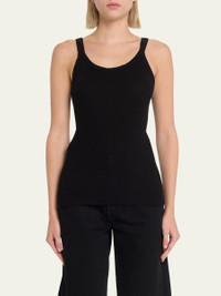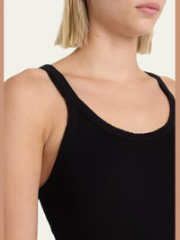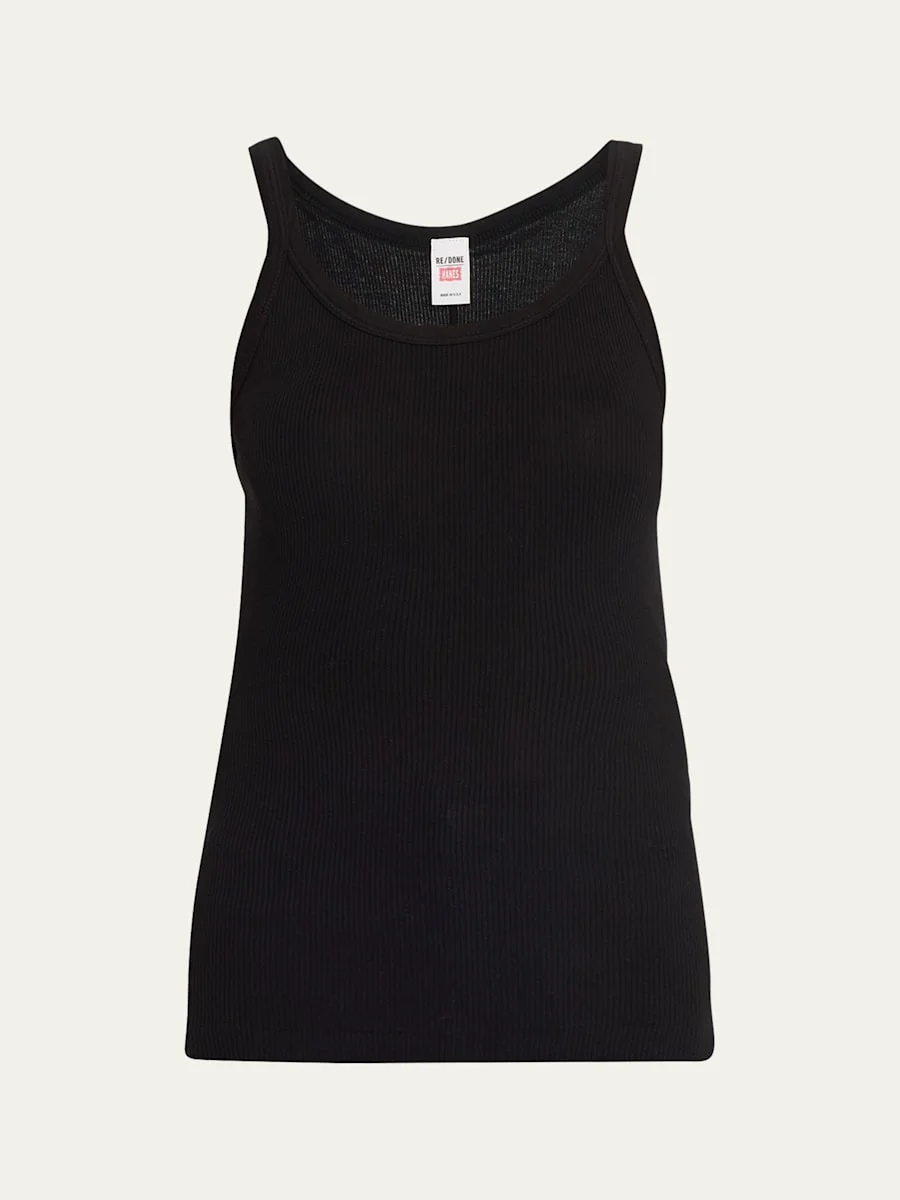 Re/Done ribbed tank. Approx. 23"L from shoulder to hem. Scoop neckline. Sleeveless; cut-in shoulders. Fitted silhouette. Pullover style. Cotton. Made in the USA. Online Inquiries: BGS21_T0QBV| Store Inquiries: #2702274