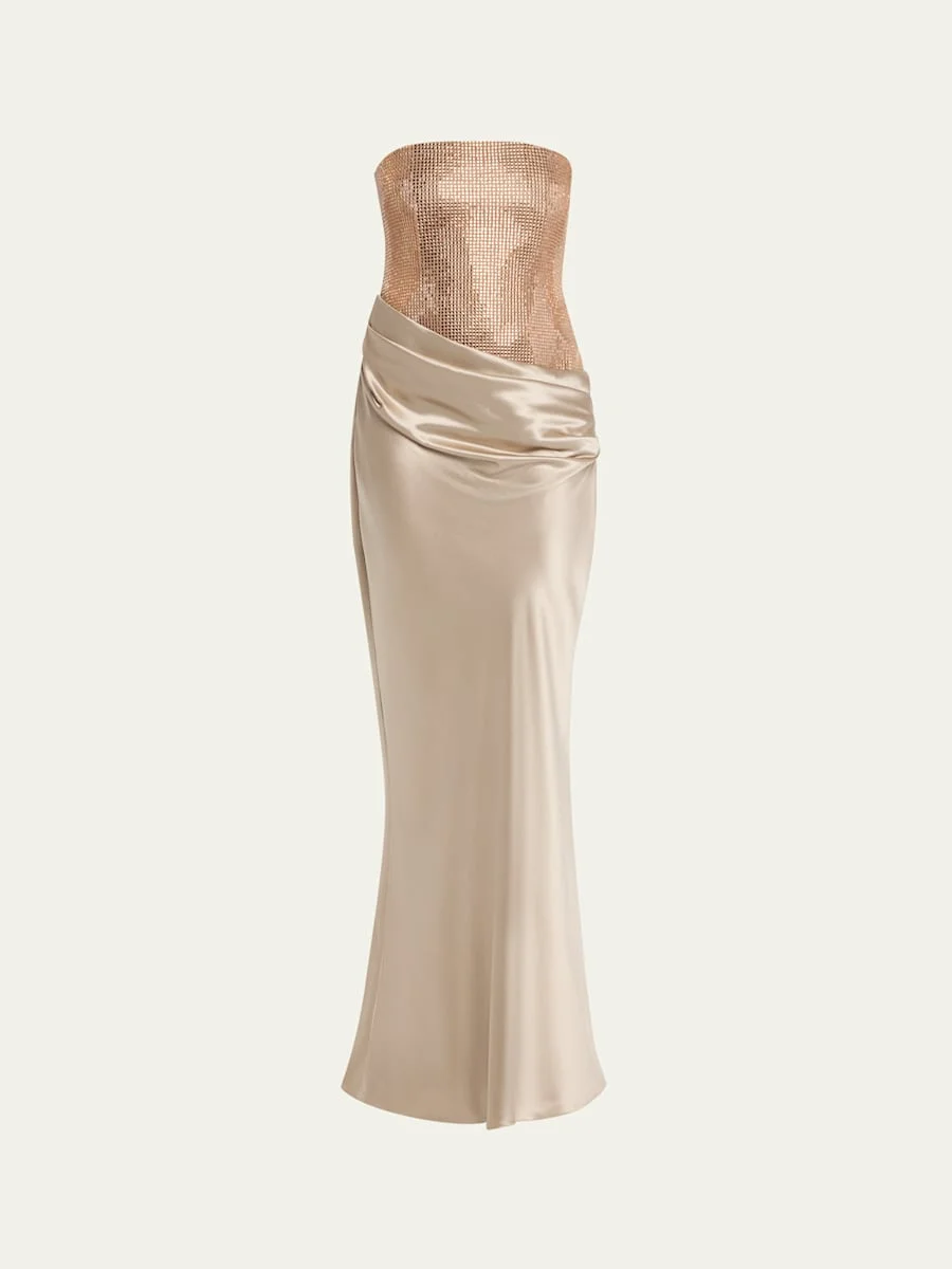 Retrofete "Alexandra" dress featuring a sequin-embellished bodice finished with draping Strapless neckline Sleeveless Column silhouette Full length Invisible side zip Acetate/polyester Dry clean Imported Online Inquiries: BGS21_T6824| Store Inquiries: #4924591