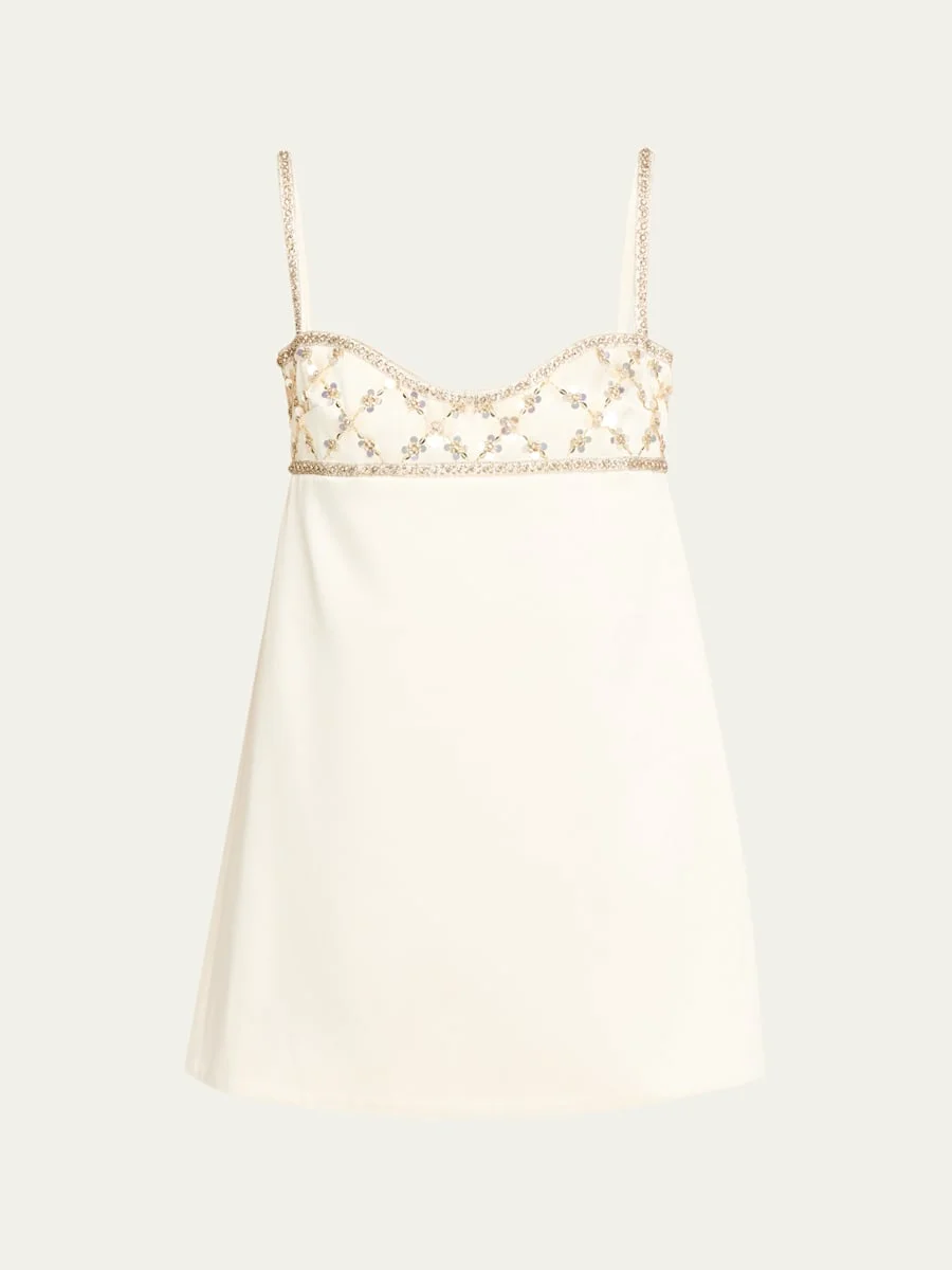 Adorned with shimmering crystals and floral sequins, the "Solere" mini dress by Retrofete is the perfect goto silhouette for any holiday party. Scoop neckline Sleeveless Empire waistline Hem falls above the knee Center back zip Polyester Dry clean Imported