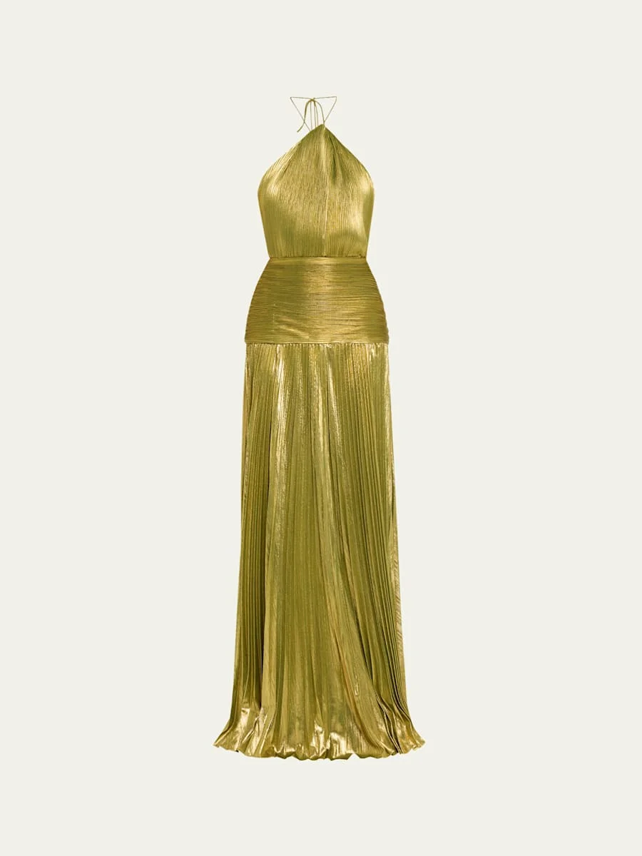 Retrofete "Thalia" pleated metallic gown Self-tie halter neckline Sleeveless Low-cut back Drop-waist silhouette Thigh-high slit Floor-sweeping hem Polyester Dry clean Imported Online Inquiries: BGS21_T6LCZ| Store Inquiries: #5002724