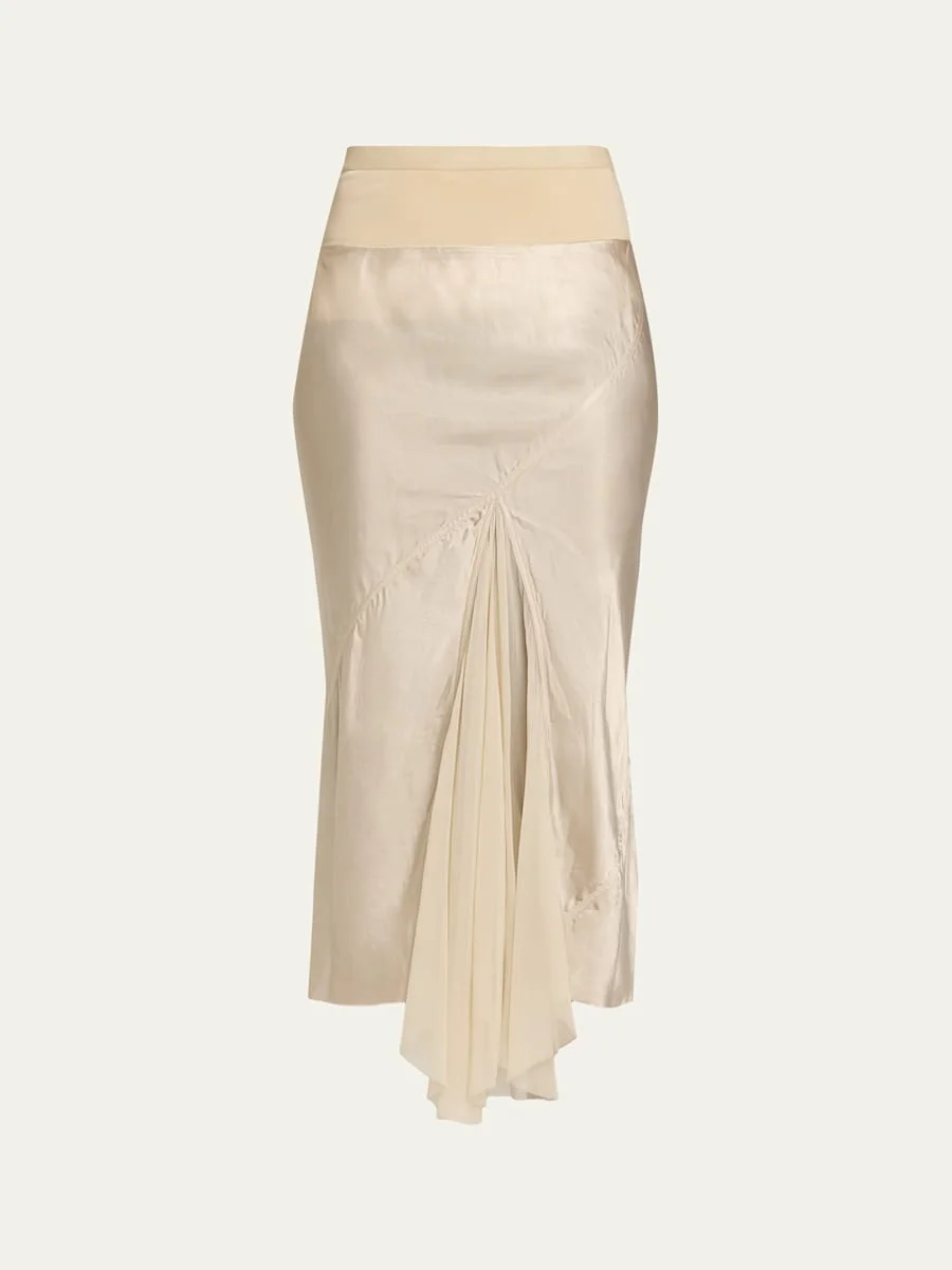 Crafted from lustrous satin cut on the bias, this skirt from Rick Owens features an asymmetric hemline with a delicate, semisheer layer of pleated chiffon sewn at the front and back, creating a subtle contrast of textures. High waist Aline silhouette Hem falls below the knee Pullon style Viscose/elastane Hand wash Made in Italy SIZE amp; FITModel measurements: 5'10" tall Model is wearing a US size 4/Small
