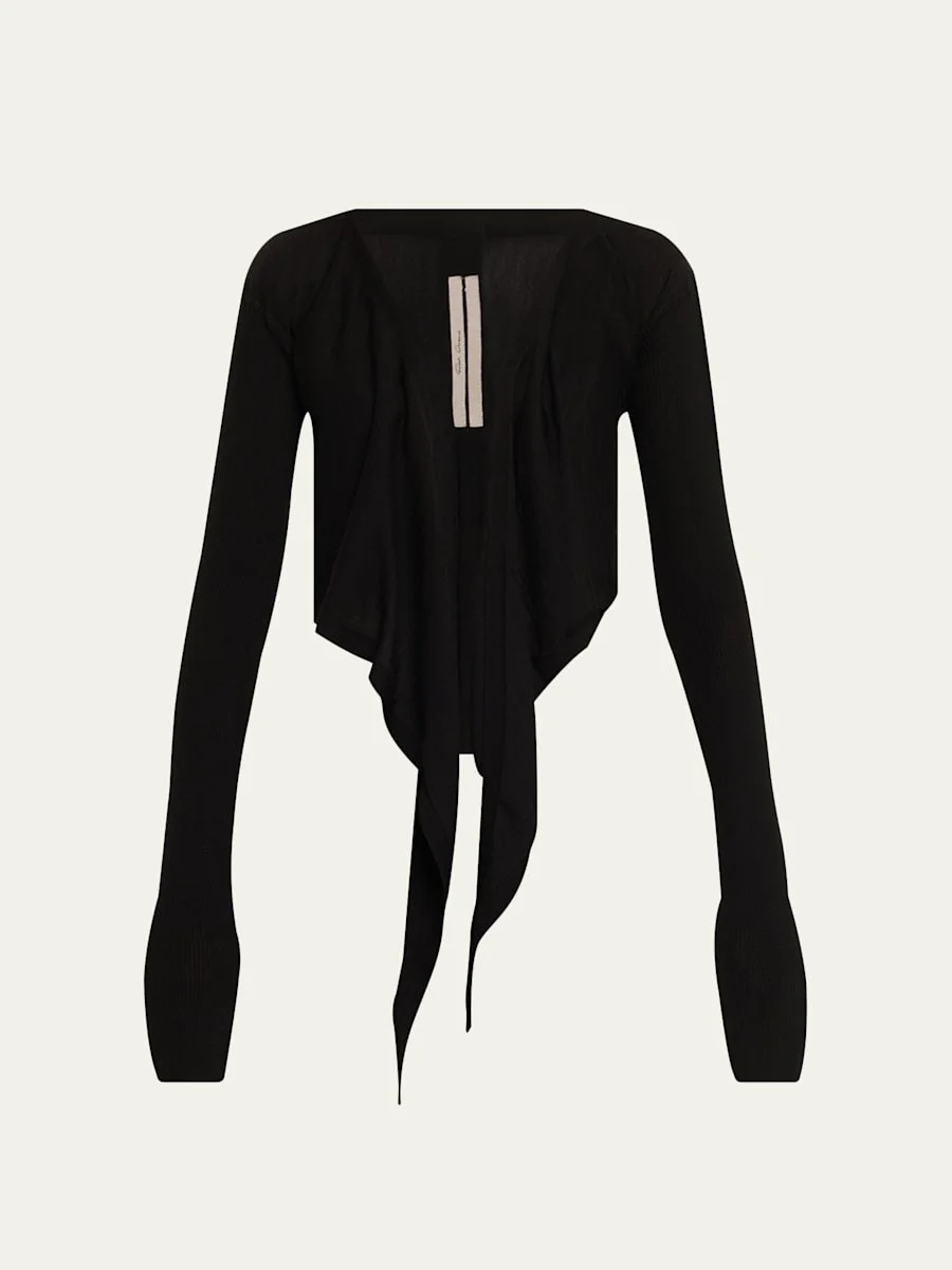 Rick Owens wrap cardigan in ribbed knit May be styled open or tied around waist Surplice neckline Long sleeves Fitted Cropped length Self-tie closure Virgin wool Made in Italy Online Inquiries: BGS21_BAAF7| Store Inquiries: #5067648