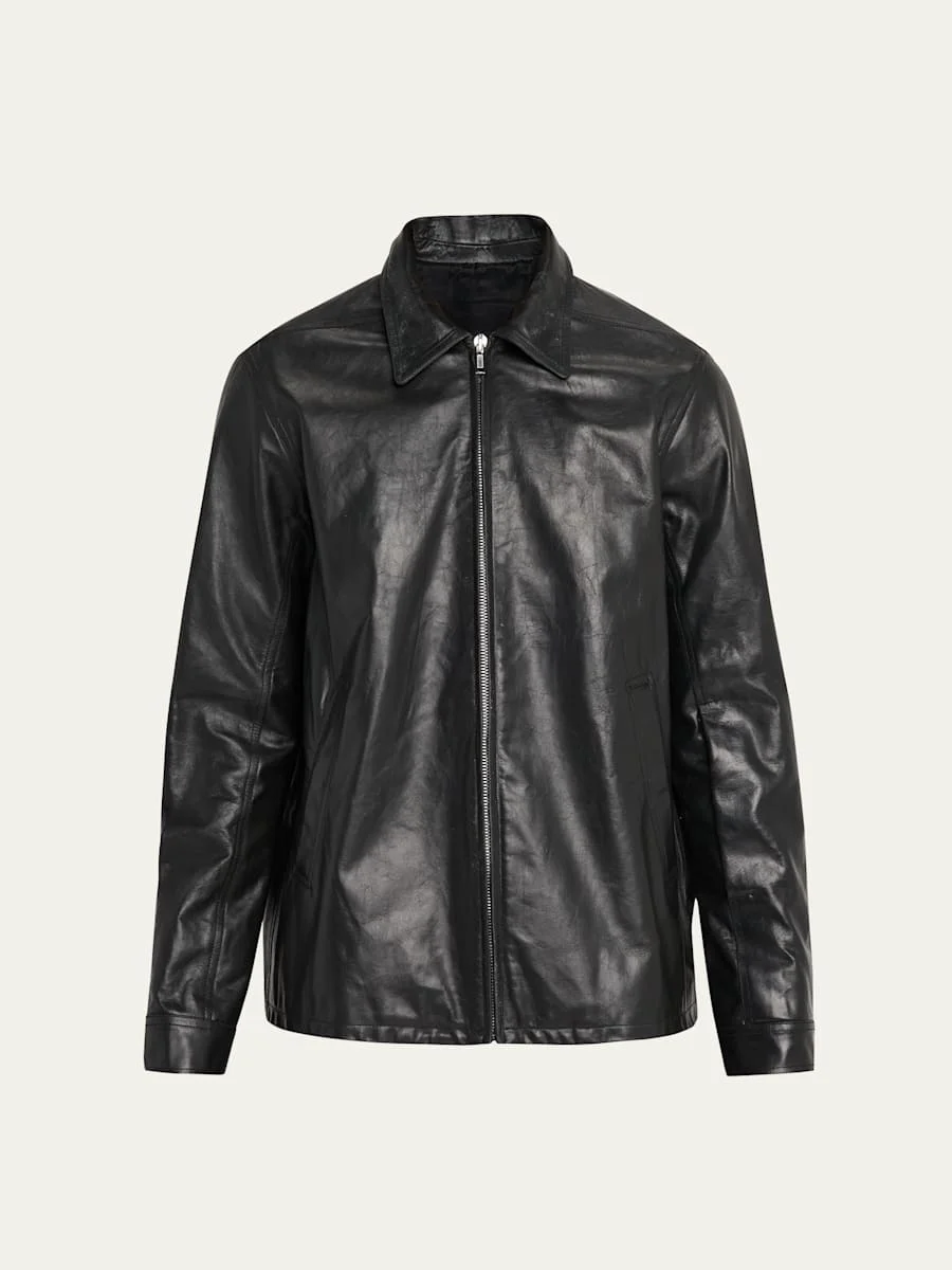 Rick Owens "Brad" blouson jacket made from smooth tamponato leather Spread collar Zip closure Welt pockets Adjustable snap cuffs Webbing strap on back yoke Imported Online Inquiries: BGS21_NCUX7| Store Inquiries: #4956489