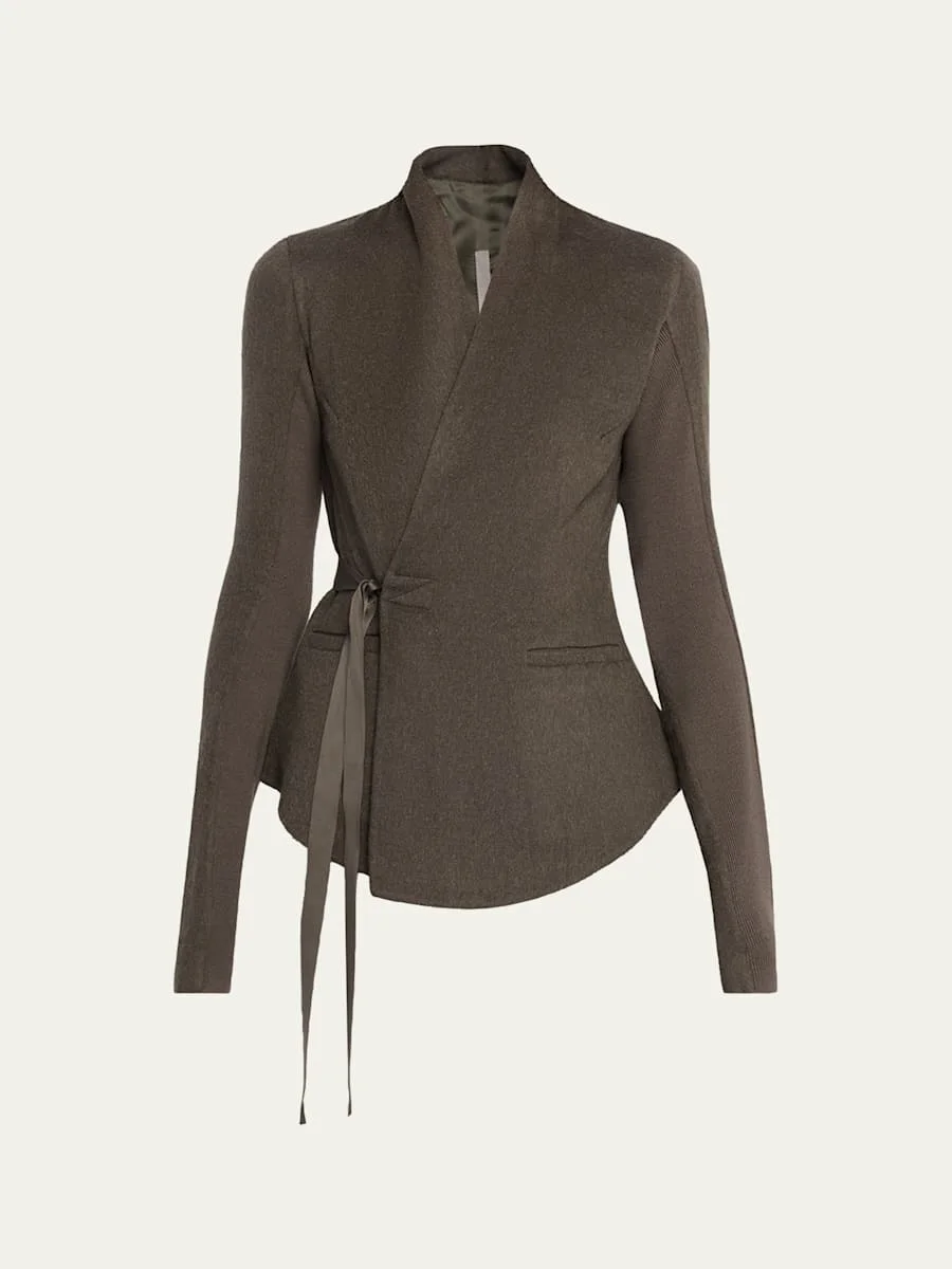 Rick Owens wrap jacket featuring a peplum flounce hem on the back Open front Long sleeves Hip welt pockets Fitted Selftie closure Wool/camel Made in Italy