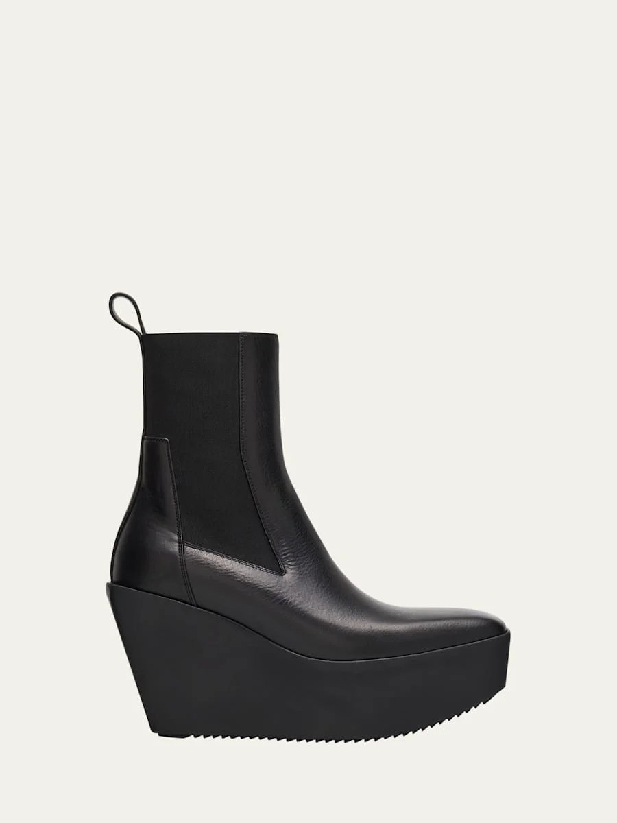 Crafted from smooth Italian calf leather atop a sculptural platform heel, these boots by Rick Owens hit just above the ankle 4.50 in / 115 mm wedge heel Square toe Elastic gored sides Pull-tab at backstay Pull-on style Rubber outsole Made in Italy Online Inquiries: BGS21_X6YL9| Store Inquiries: #5057909