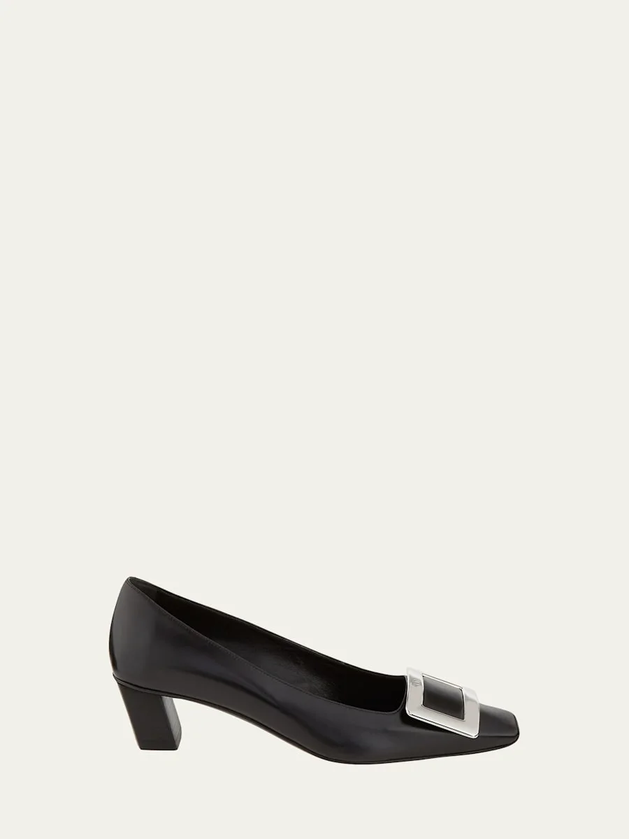 Roger Vivier leather ballerina pump. 1.8" angled heel. Square toe. Signature pilgrim buckle. Topstitched collar. Slip-on style. Made in Italy. Online Inquiries: BGS21_X6A2N| Store Inquiries: #1643825