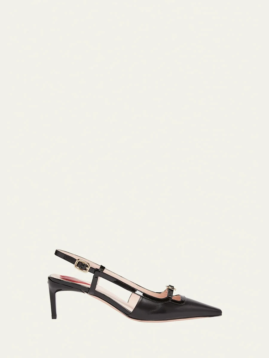 Roger Vivier matte and patent leather pumps. 2.17 in / 55mm stiletto heel. Pointed toe. Mid-vamp mini buckle strap. Anchored adjustable slingback strap. Leather outsole. Lining: Leather. Spot clean. Made in Italy. Online Inquiries: BGS21_X6LNF| Store Inquiries: #4802775