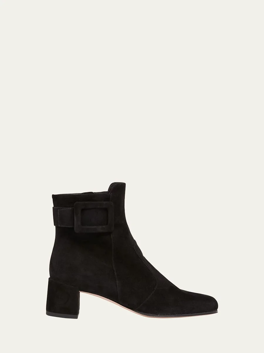 Roger Vivier "Tres Vivier" suede ankle booties with signature pilgrim buckle accent. 1.75 in / 45 mm block heel. Round toe. Side zip eases dress. Leather lining and sole. Made in Italy. Online Inquiries: BGS21_X6MGZ| Store Inquiries: #4825273