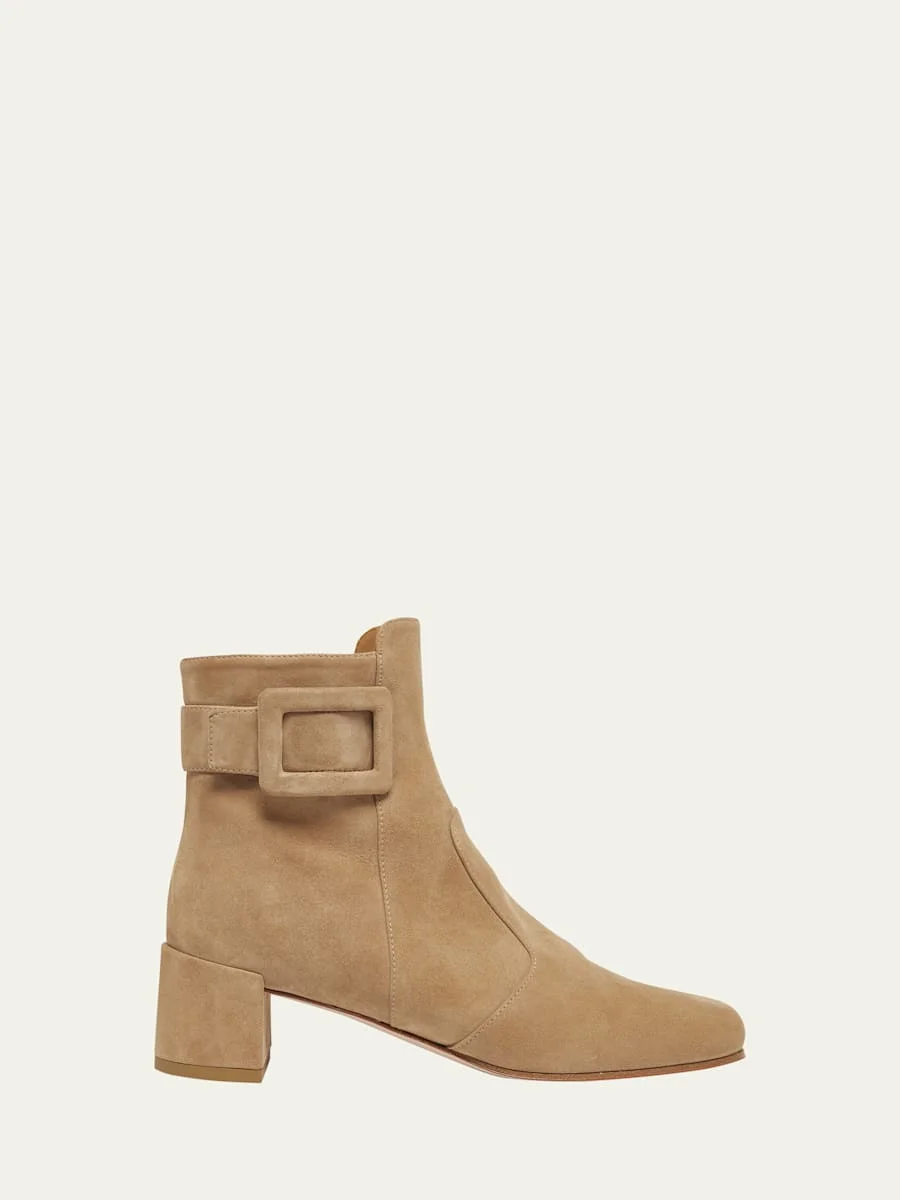Roger Vivier "Tres Vivier" suede ankle booties with signature pilgrim buckle accent. 1.75 in / 45 mm block heel Round square toe Side zip eases dress Leather outsole Lining: Unlined Spot clean Made in Italy