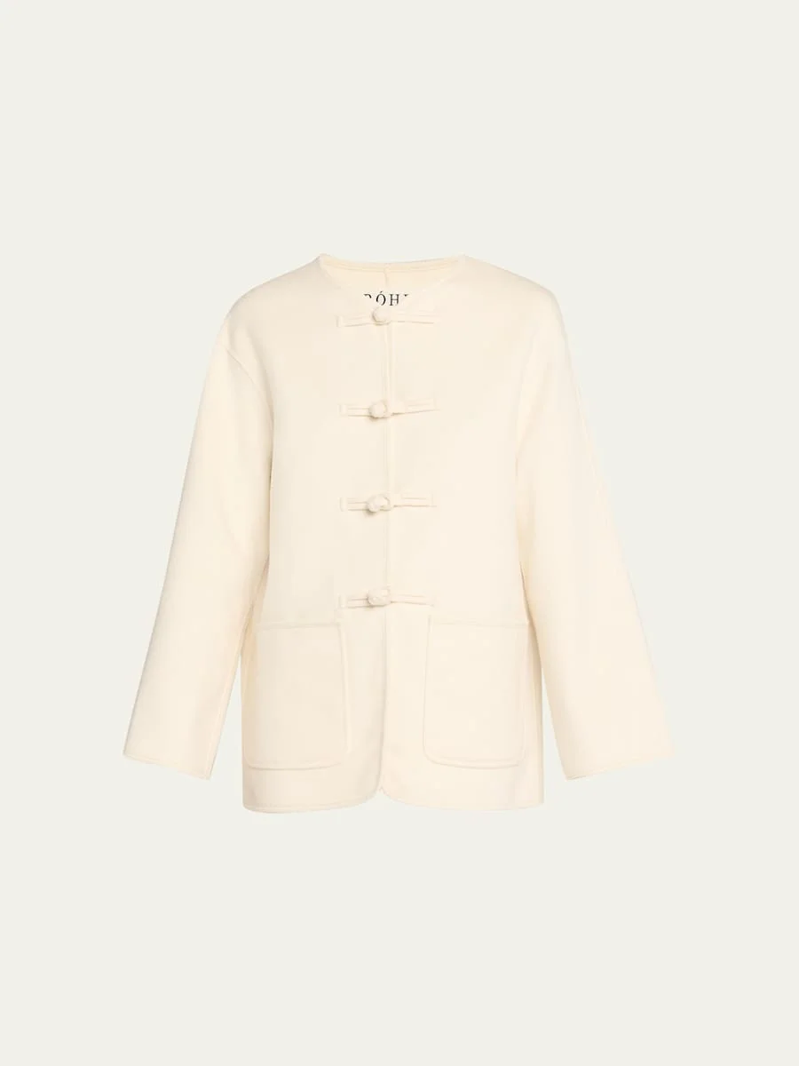 Cut from a luxurious doublewool and cashmere blend, this Rohe jacket boasts a knotted toggle front for an elevated, tailored silhouette. Round neckline Long sleeves Patch pockets Relaxed fit Hem falls to the hip Buttonfront Wool/cashmere Dry clean Made in Italy