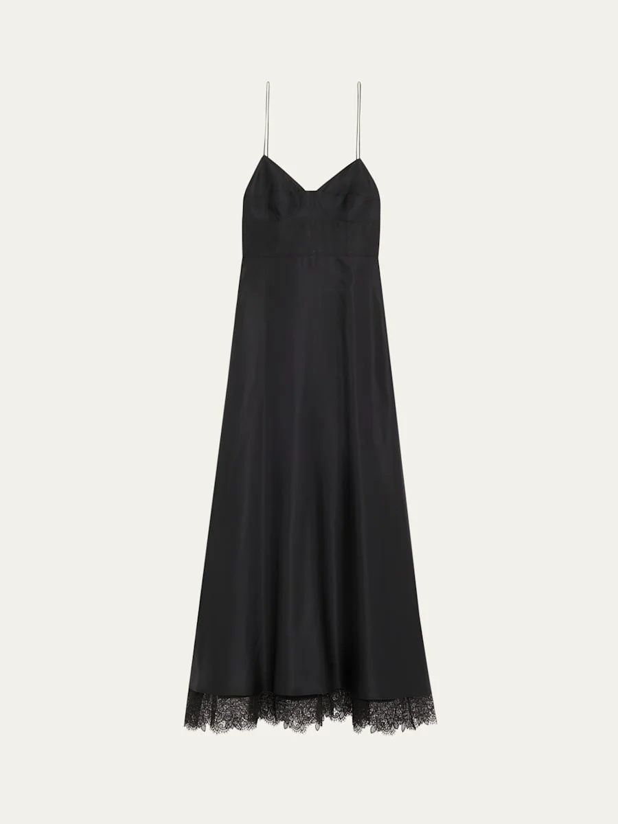 A graceful design blending elegance and detail. Our bustier silk lace dress has a floor-length fit and flare design with elongated back straps and beautiful, delicate lace trim detailing along the hemline, featuring a fitted bustier style bodice. Rohe luxurious silk dress finished with lace trim V neckline Spaghetti straps Fit-and-flare silhouette Full length Side zip Silk Dry clean Imported Online Inquiries: BGS21_T6LK4| Store Inquiries: #5004719