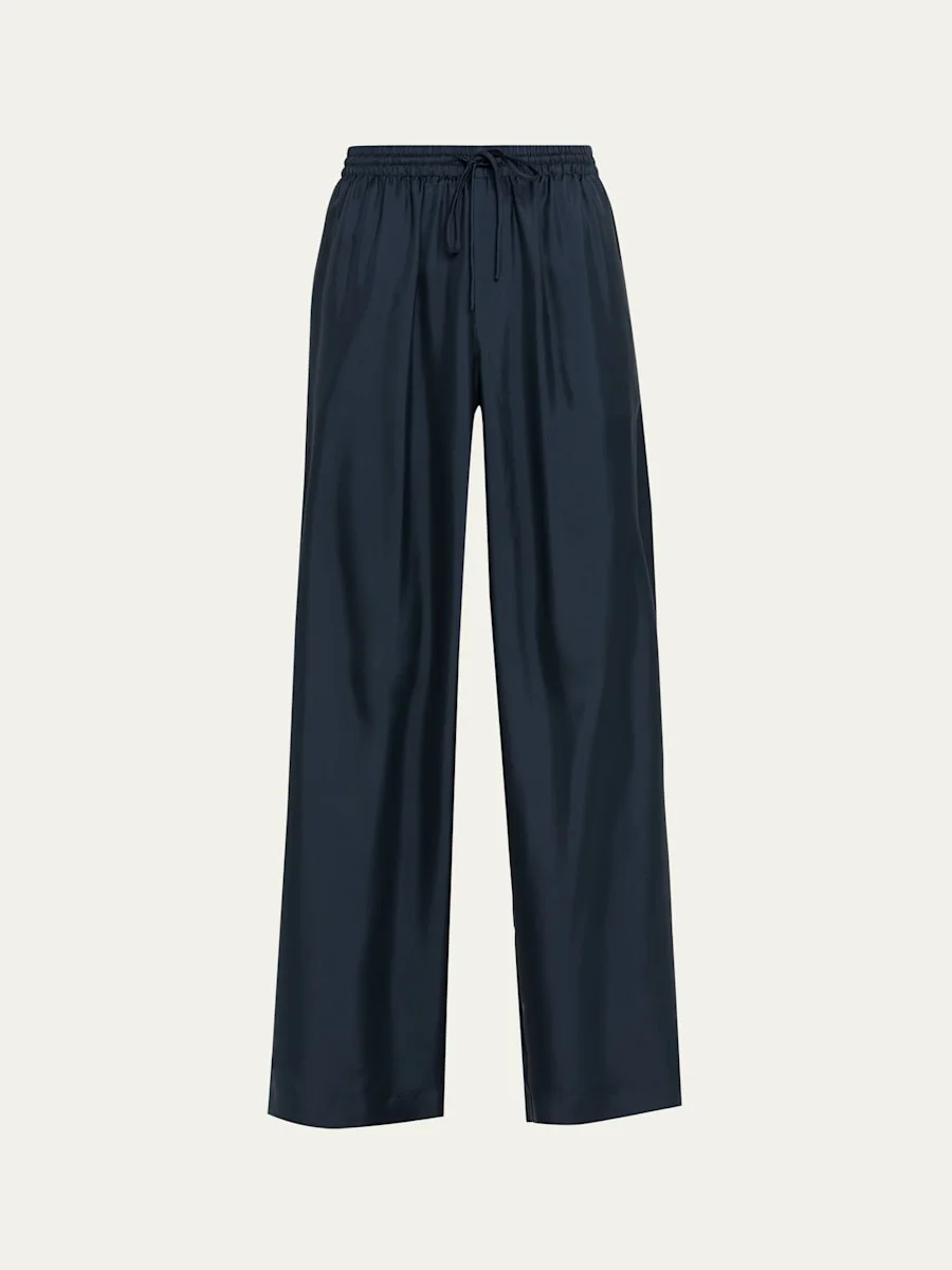 Rohe luxurious silk trousers finished with a drawstring waistband for comfort Midrise; sits high on the hip Wide legs Full length Pullon style Silk Hand wash or dry clean Made in Italy