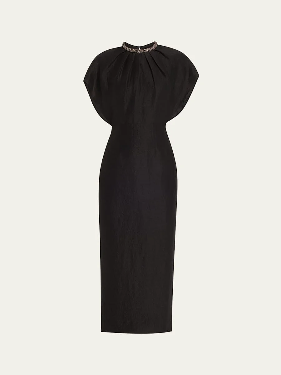 Roland Mouret dress features diamante embellishment on the gathered neckline Round neckline Short puff sleeves Hem falls below the knee Sheath silhouette Back walking slit Zip closure Polyester Dry clean Trim: Metal, crystal Imported Proposition 65 warning for California residents Online Inquiries: BGS21_B9YC4| Store Inquiries: #5000123
