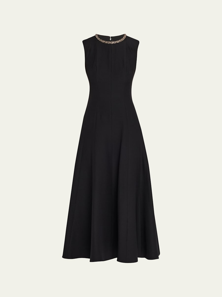 Fit-and-Flare Wool Silk Dress with Diamante Neck
