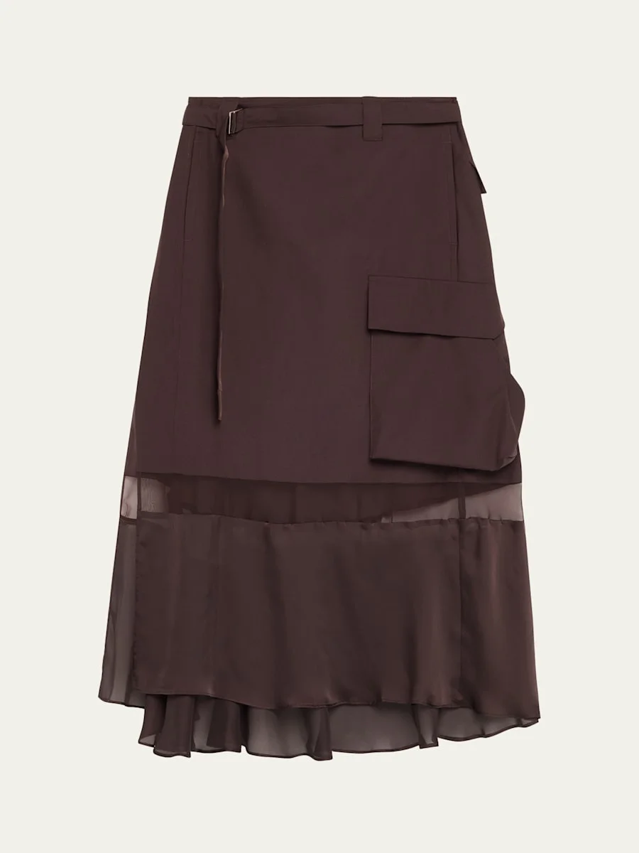 Designed in suiting fabric, this SACAI midi skirt is crafted with contrasting opaque and sheer panels, the asymmetric hem adding fluid movement Sits high on the hips Adjustable belt On-seam pockets Back flap pocket Exaggerated side flap pocket Hem falls below the knee A-line silhouette Polyester/wool Dry clean Made in Japan Online Inquiries: BGS21_BAABJ| Store Inquiries: #5067205