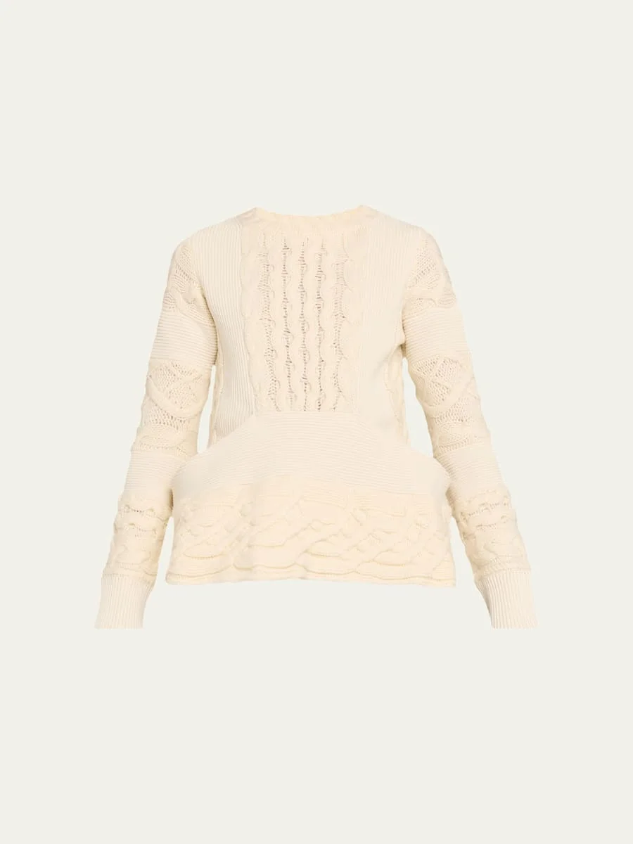 SACAI knit sweater reimagined with cable knit panels and a peplum flounce hem Crew neckline Long sleeves; ribbed cuffs Side slip pockets Relaxed fit Pullover style Wool/polyester Dry clean Imported Online Inquiries: BGS21_BAABA| Store Inquiries: #5067201