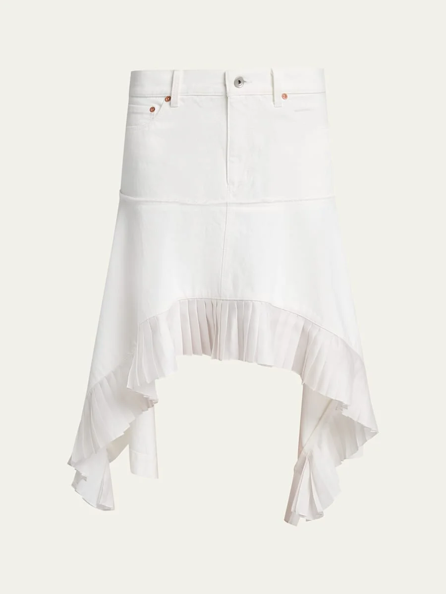 Crafted from denim, this skirt from SACAI features a rawedge flounce panel trimmed with pleated satin along the hem Mid waist Fivepocket style Trumpet silhouette Highlow, handkerchief hem Button/zip fly; belt loops Cotton/polyester Dry clean Made in Japan