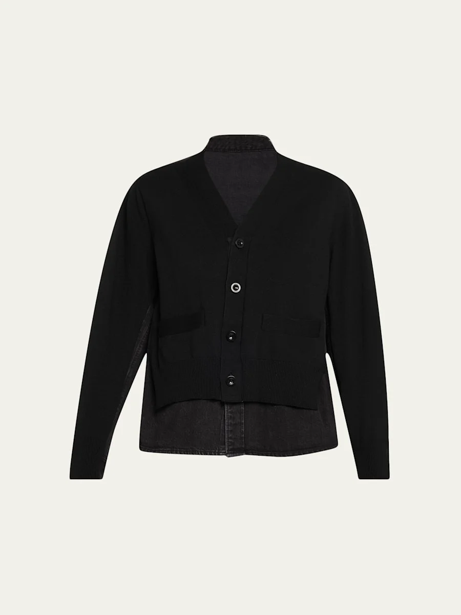 This knit cardigan by SACAI features a contrasting mediumwash denim back and hem V neckline; button front Long sleeves; snap cuffs Front welt pockets Relaxed fit Hip length Cotton/polyester Made in Japan