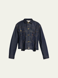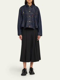 SACAI trucker jacket made from denim fabric with contrast topstitching Spread collar; button front Long sleeves; button cuffs Relaxed fit Peplum hem Cotton Dry clean Imported Online Inquiries: BGS21_BA3QP| Store Inquiries: #5024011