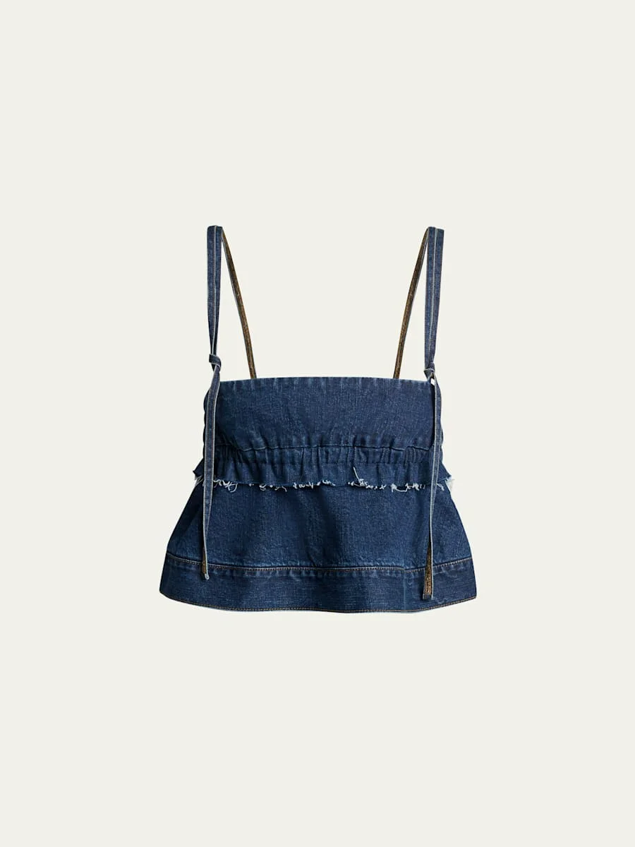 SACAI peplum top is crafted from darkwashed denim accented with a rawedge layered detail, an elasticized back, and selftie shoulder straps Square nekcline Sleeveless Relaxed fit Cropped length Pullover style Cotton Dry clean Made in Japan
