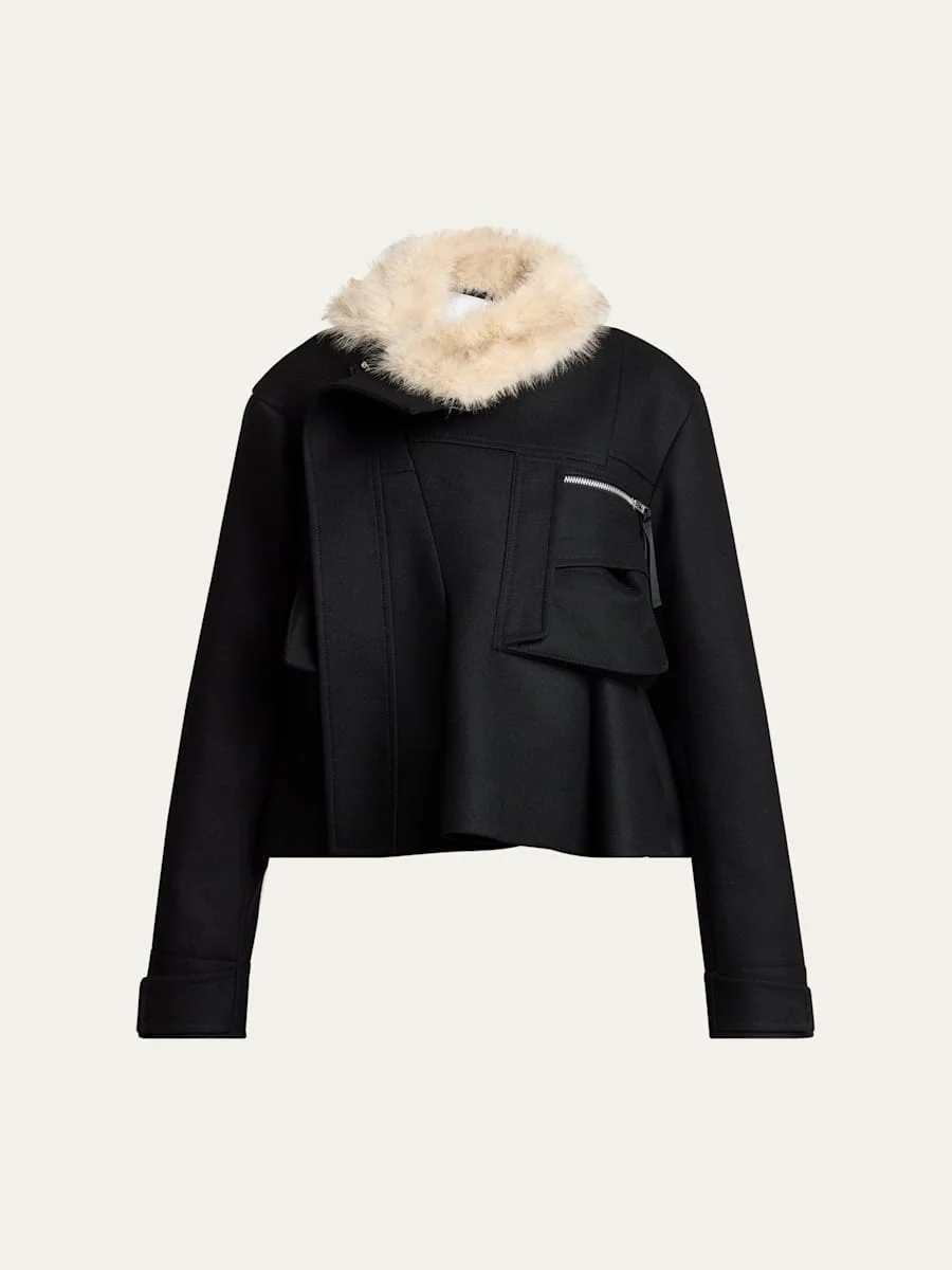 Balancing sharp tailoring with a touch of softness, this SACAI wool utility coat is enhanced by layered oversized flap pockets and a contrasting faux fur (polyester) collar Spread collar; off-center concealed zip front Long sleeves; snap-tab cuffs Chest flap pockets Hip slip pockets Boxy fit Hip length Back flounce hem Wool/polyester Dry clean Made in Japan Online Inquiries: BGS21_BAABG| Store Inquiries: #5067189
