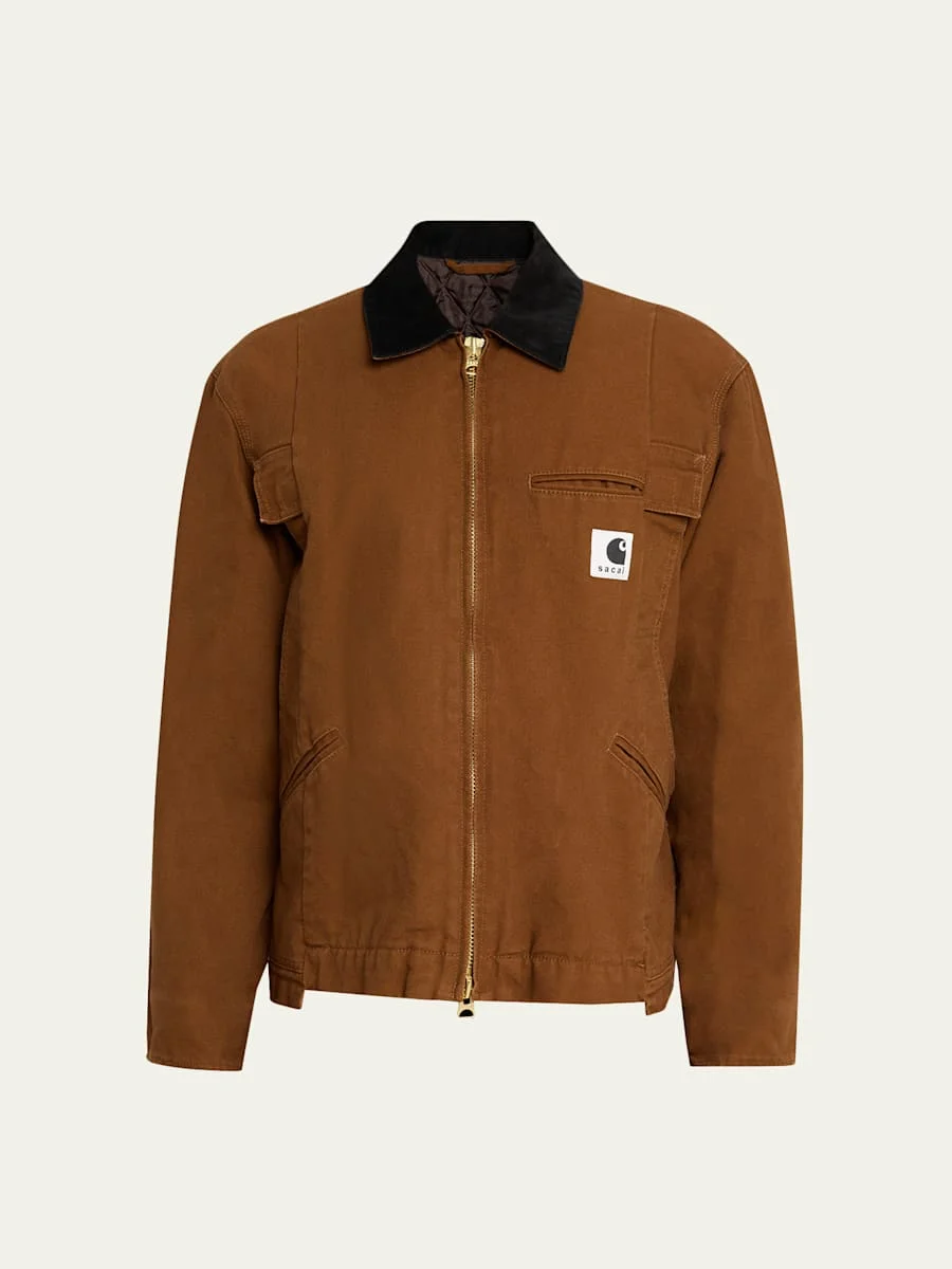 SACAI x CARHARTT WIP jacket crafted from signature triplestitched, durable duck canvas with a waterresistant finish Corduroy spread collar; twoway front zip Long sleeves Logo patch at left chest Front besom pockets Relaxed fit Midlength Cotton/polyester/polyurethane Dry clean Made in Japan
