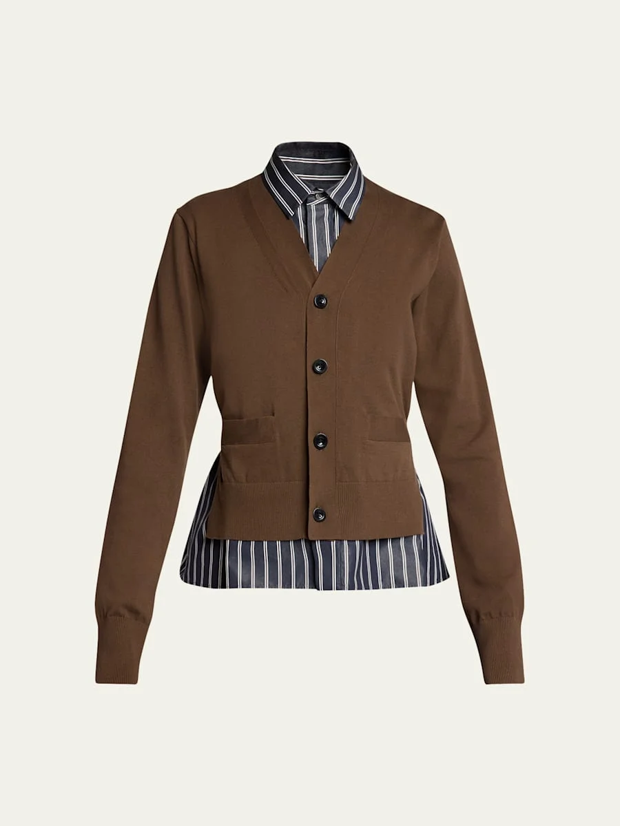 SACAI top is crafted from striped poplin shirting layered with a cotton knit cardigan combo Features a belt cinching the back of the waist and creating a gathered peplum flounce Point collar; button front Long sleeves; ribbed cuffs Yoked back; box pleat Hip welt pockets Belted back of waist Relaxed fit Hip length Cotton/polyester Dry clean Imported