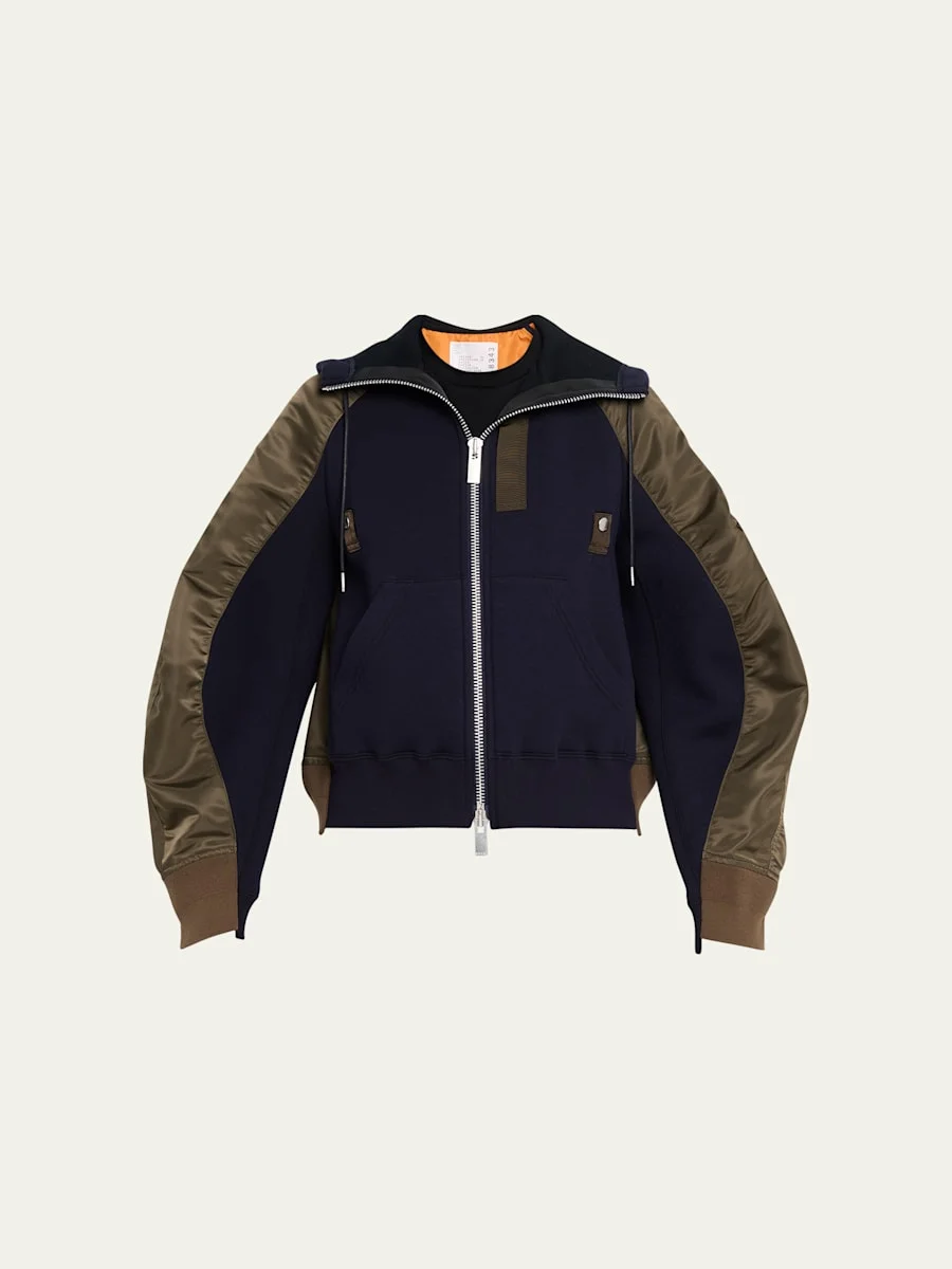 SACAI jacket is crafted from sponge scuba and nylon combo accented with a zipper sleeve pocket and snaptab chest details Drawstring hooded neckline; twoway zip front Long sleeves Front split kangaroo pocket Loose fit Hip length Ribbed cuffs and hem Cotton/polyester/nylon/polyamide Dry clean Made in Japan