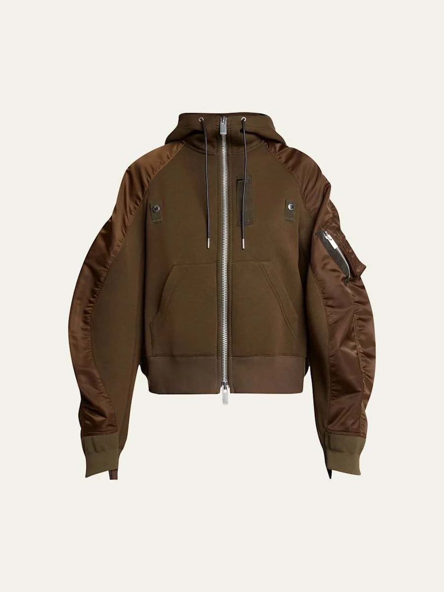 SACAI jacket is crafted from sponge scuba and nylon combo accented with a zipper sleeve pocket and snaptab chest details Drawstring hooded neckline; twoway zip front Long sleeves Front split kangaroo pocket Loose fit Hip length Ribbed cuffs and hem Cotton/polyester/nylon/polyamide Dry clean Made in Japan