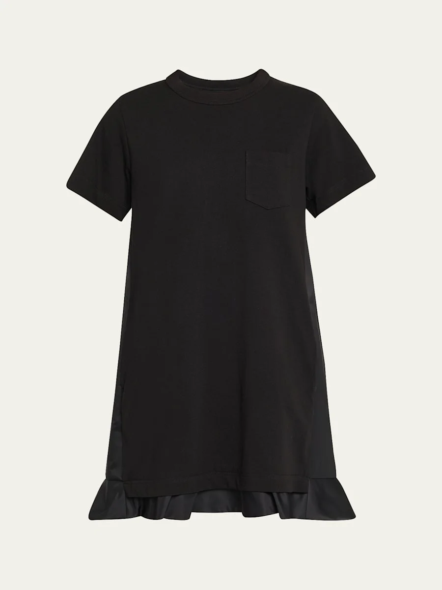 SACAI cotton T-shirt dress with a nylon flowy back combo and a ruffle hem Round neckline Short sleeves Chest patch pocket Yoked back; inverted pleat Shift silhouette Mini length Slipover style Cotton/cupro Dry clean Made in Japan Online Inquiries: BGS21_BAAAT| Store Inquiries: #5067194