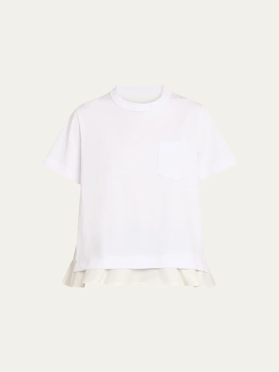 Light nylon twill meets cotton jersey in this hybrid SACAI T-shirt, the airy back and ruffle hem adding lightweight fluid movement Crew neckline Short sleeves Chest patch pocket Box-pleated back yoke A-line fit Pullover style Cotton/nylon/polyamide Dry clean Made in Japan Online Inquiries: BGS21_BAAAV| Store Inquiries: #5067204