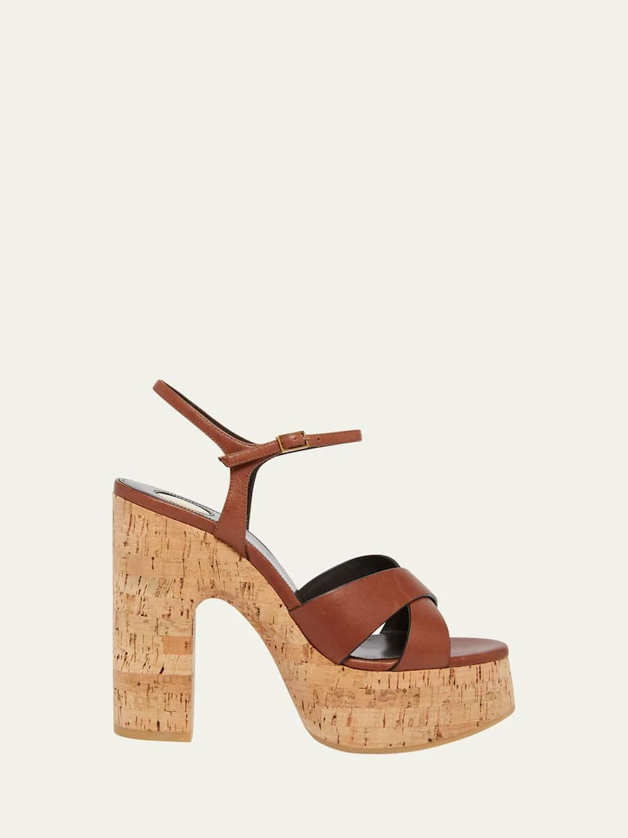 Saint Laurent "Bianca" leather platform sandals 3.25 in / 85 mm cork block heel Open toe Crisscross vamp Adjustable ankle strap Rubber outsole Made in Italy Online Inquiries: BGS21_X6SD6| Store Inquiries: #4933578