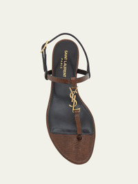 Saint Laurent "Cassandra" lizardembossed calf leather sandals with goldtone YSL medallion 0.17 in / 5 mm flat heel Thong strap Tstrap vamp Adjustable slingback strap Made in Italy