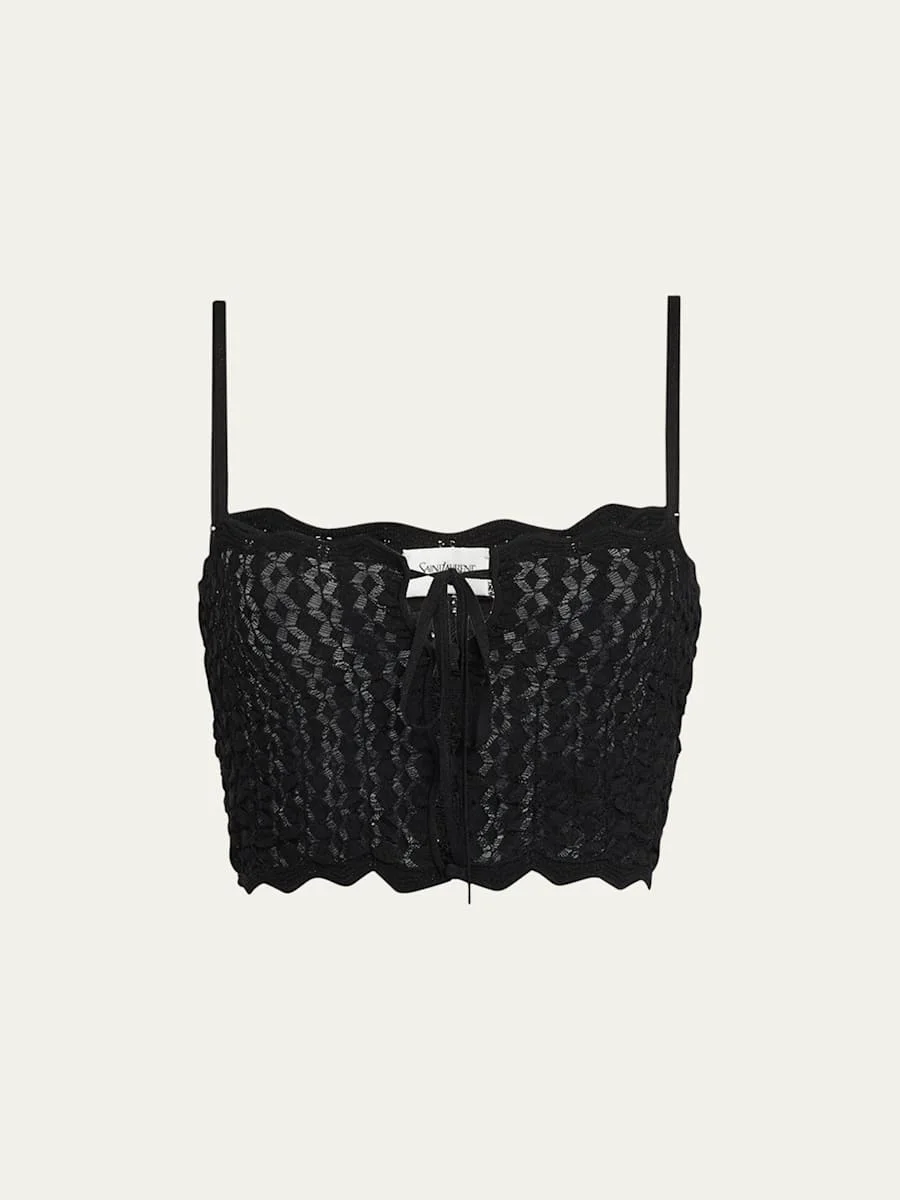 Saint Laurent sheer openwork pointelle knit top Square neckline; button front Adjustable shoulder straps Slim fit Cropped length Scallop hem Viscose/polyester Made in Italy Proposition 65 warning for California residents Online Inquiries: BGS21_B9PAZ| Store Inquiries: #4934489