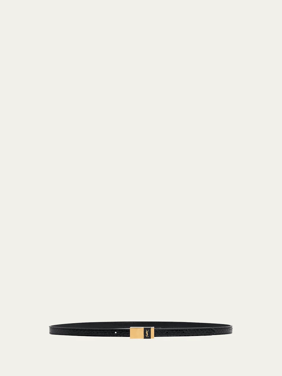 Saint Laurent embossed skinny belt in calf leather Approx. 0.5"W Adjustable fit YSL buckle closure Tapered end Professional cleaning recommended Made in Italy Online Inquiries: BGS21_D507M| Store Inquiries: #4869337