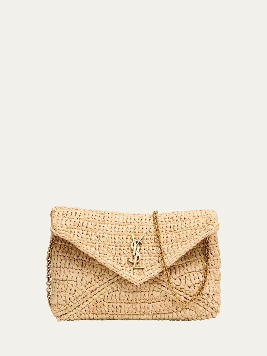 Saint Laurent raffia pouch bag decorated with vegetabletanned leather Chain and leather shoulder strap, 17.3" drop Can be worn as a clutch or shoulder/crossbody bag Envelope flap top with magnetic YSL logo closure Interior, one card slot Approx. 4.7"H x 7.5"W x 1.2"D Made in Italy