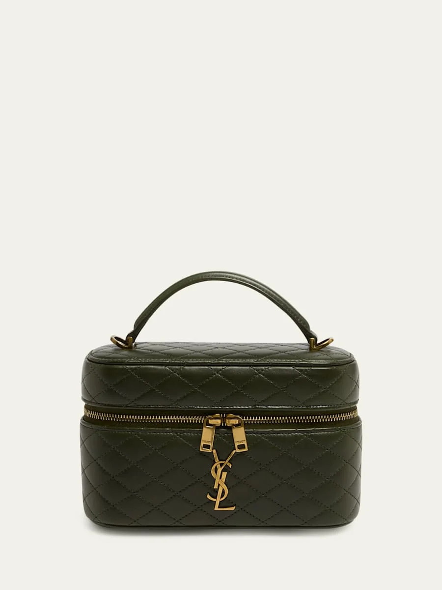 Saint Laurent "Vanity" top handle bag in quilted leather Features signature YSL logo lettering Top handle Detachable, adjustable crossbody strap, 20.4"L Can be worn as a top handle or crossbody bag Twoway zip top closure Interior, one card slot Golden hardware Approx. 4.3"H x 7"W x 2.5"D Made in Italy