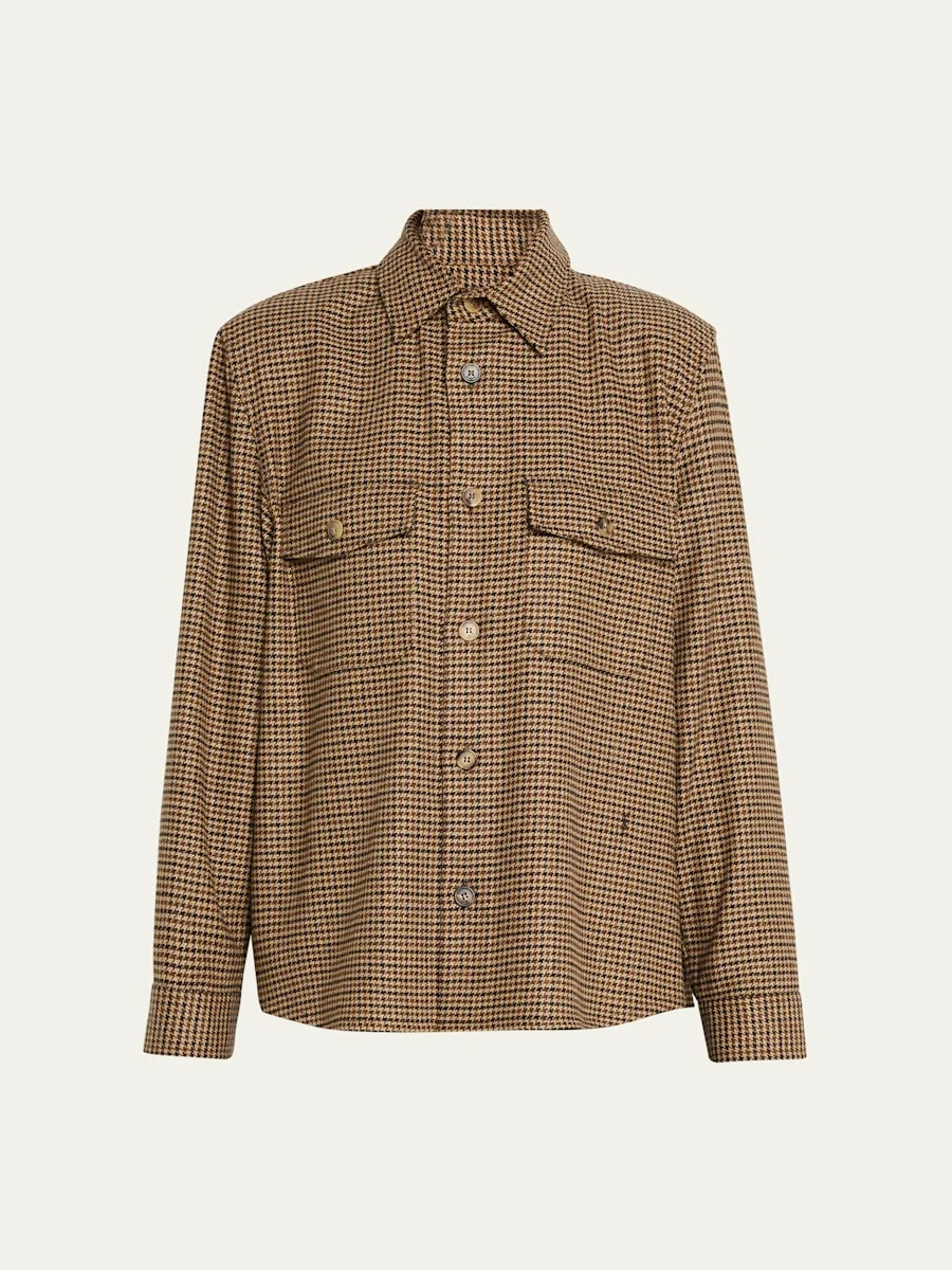 Saint Laurent shirt jacket is crafted of wool-blend houndstooth Point collar; button front Long sleeves; button cuffs Chest button flap pockets Loose fit Shirttail hem Wool/acrylic/polyester Made in Italy Online Inquiries: BGS21_BA8X0| Store Inquiries: #5055994
