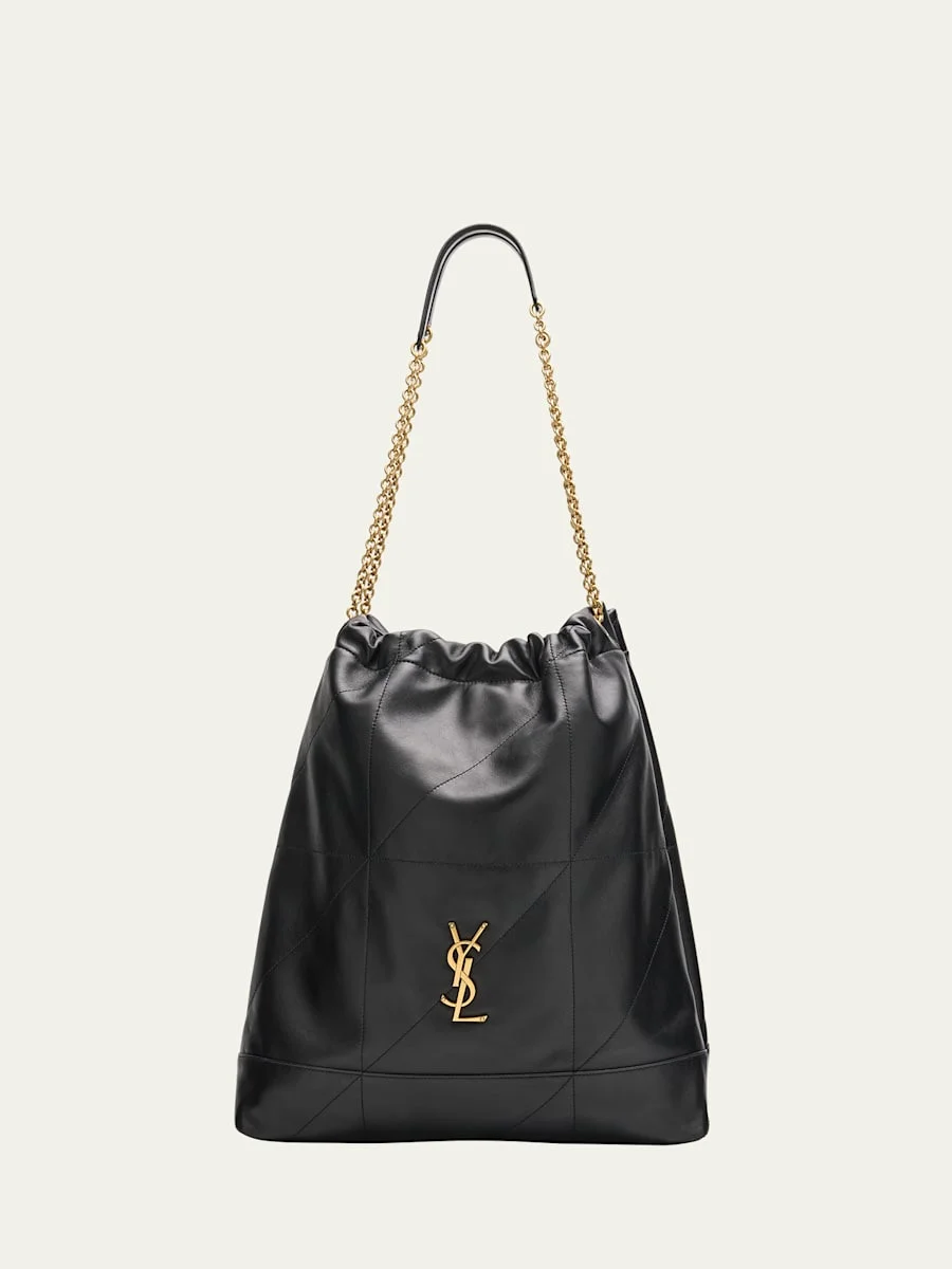 Saint Laurent "Jamie Pochon" shoulder bag in quilted lambskin leather Feature signature YSL logo lettering Chain/leather shoulder straps; 14" drop Adjustable drawstring with magnetic closure Interior, removable leashed zip pouch bag Bronze hardware Cotton lining Approx. 13.4" x 10.2" x 0.8" Made in Italy