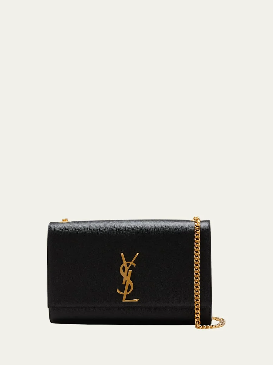 Saint Laurent chrome-metal free tanned leather shoulder bag. Chain shoulder strap, 19" drop. Strap can be worn single or doubled. Front flap with YSL logo; snap closure. Interior, one slip pocket. Organic cotton/suede lining. 6"H x 9.5"W x 2.1"D. "Kate" is made in Italy. Online Inquiries: BGS21_V2G3T| Store Inquiries: #294477